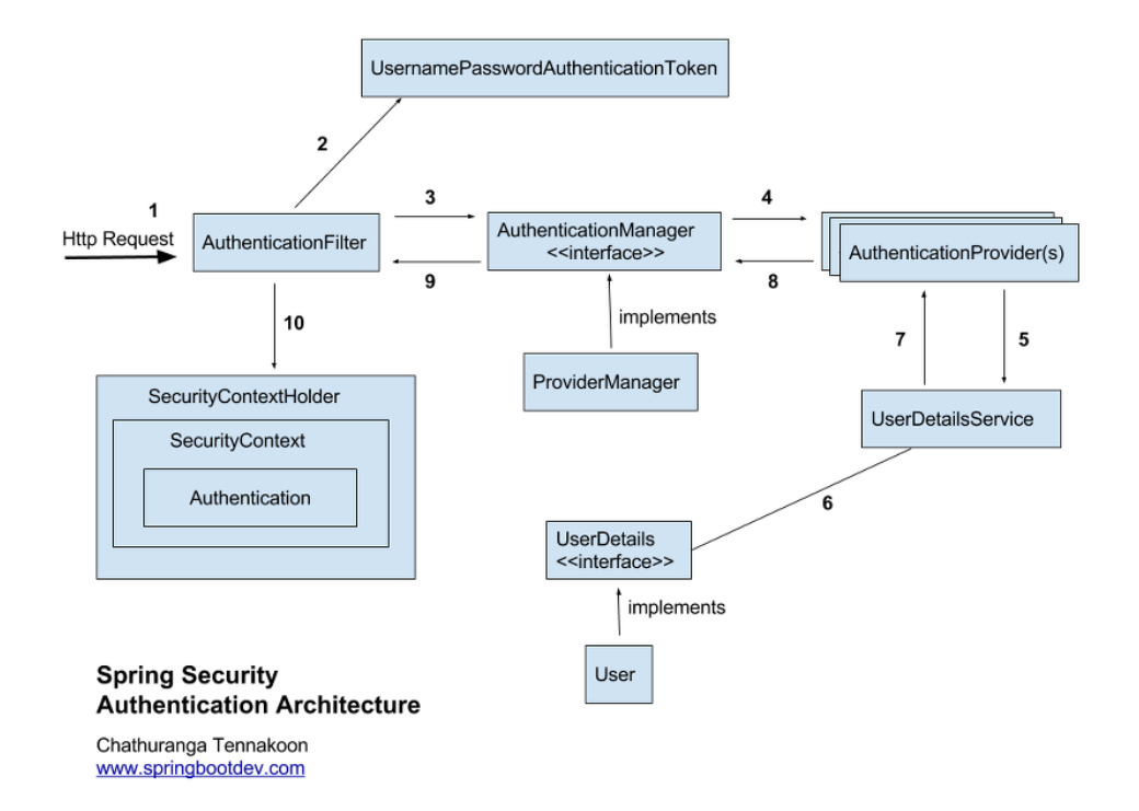Spring Security는 아래 이미지와 같은 Architecture를 가지며 보안 처리를 하고 있는 모습을 볼 수 있습니다.