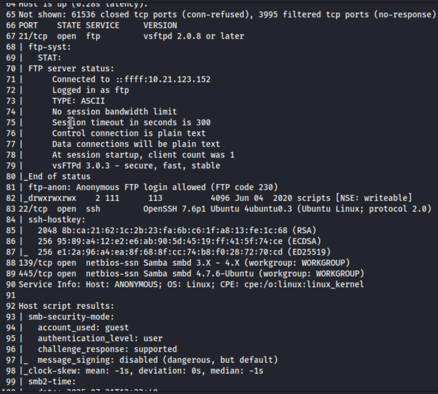 이렇게 우리는 21(FTP), 22(SSH), 139, 445(SMB), 로 총 4개의 port가 열려있음을 확인했습니다.