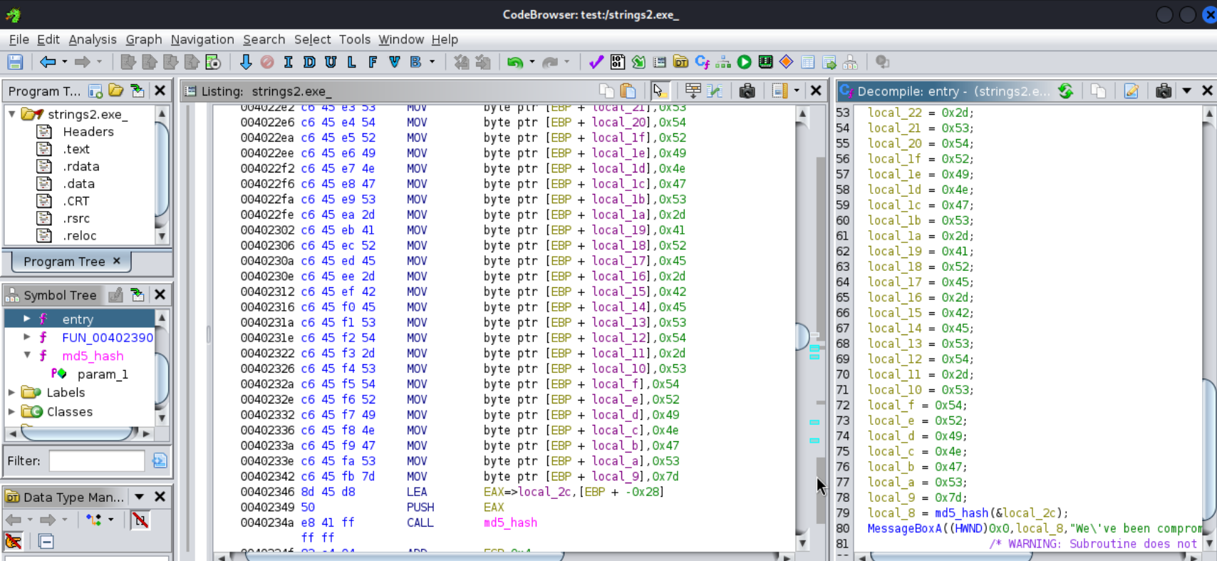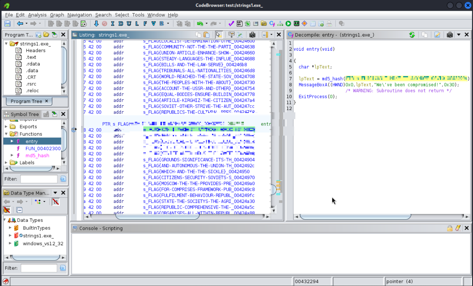 목표 : strings1.exe_ 실행 파일이 출력하는 MD5 해시의 원본 문자열 플래그를 찾는 것입니다.
