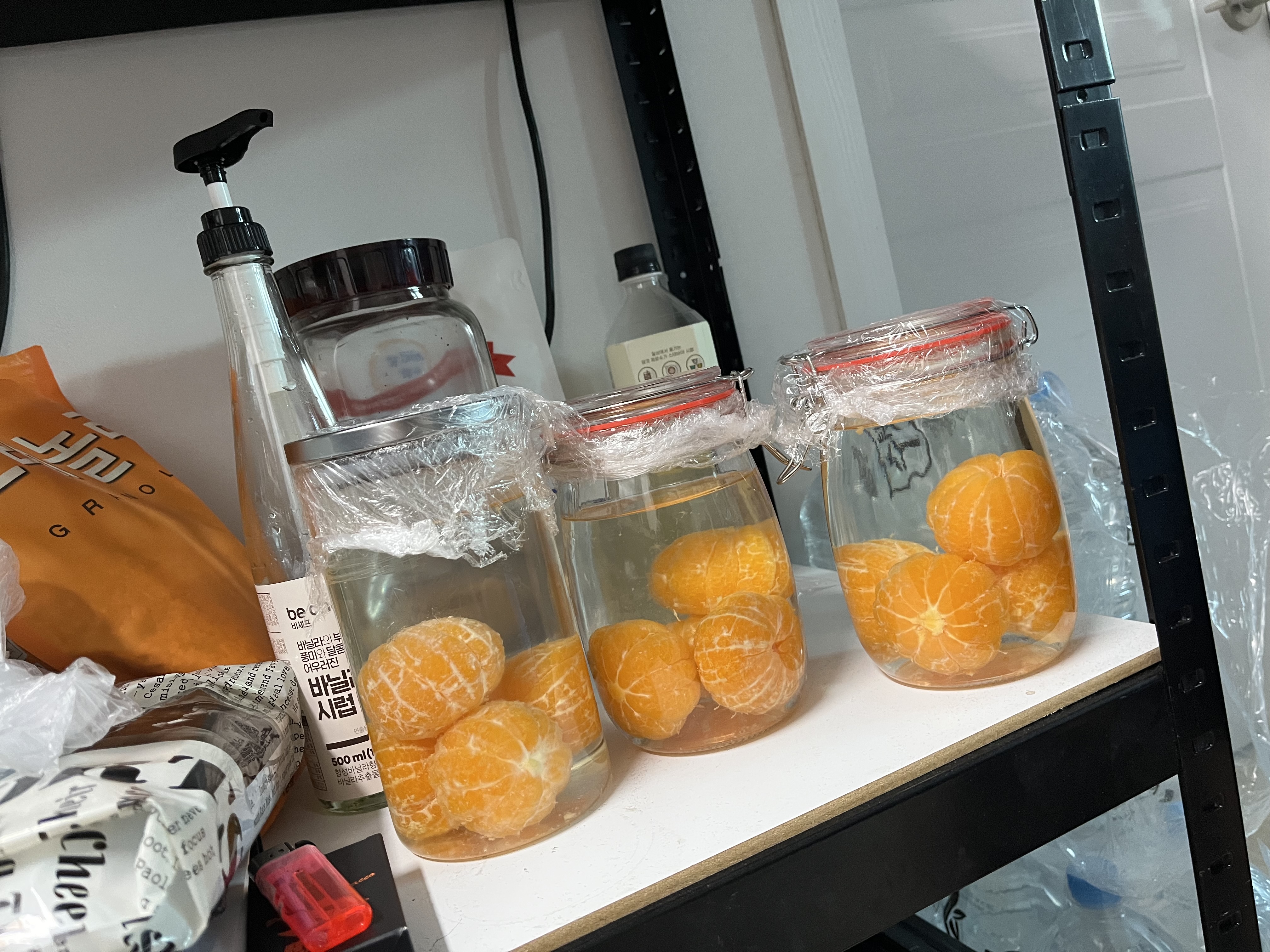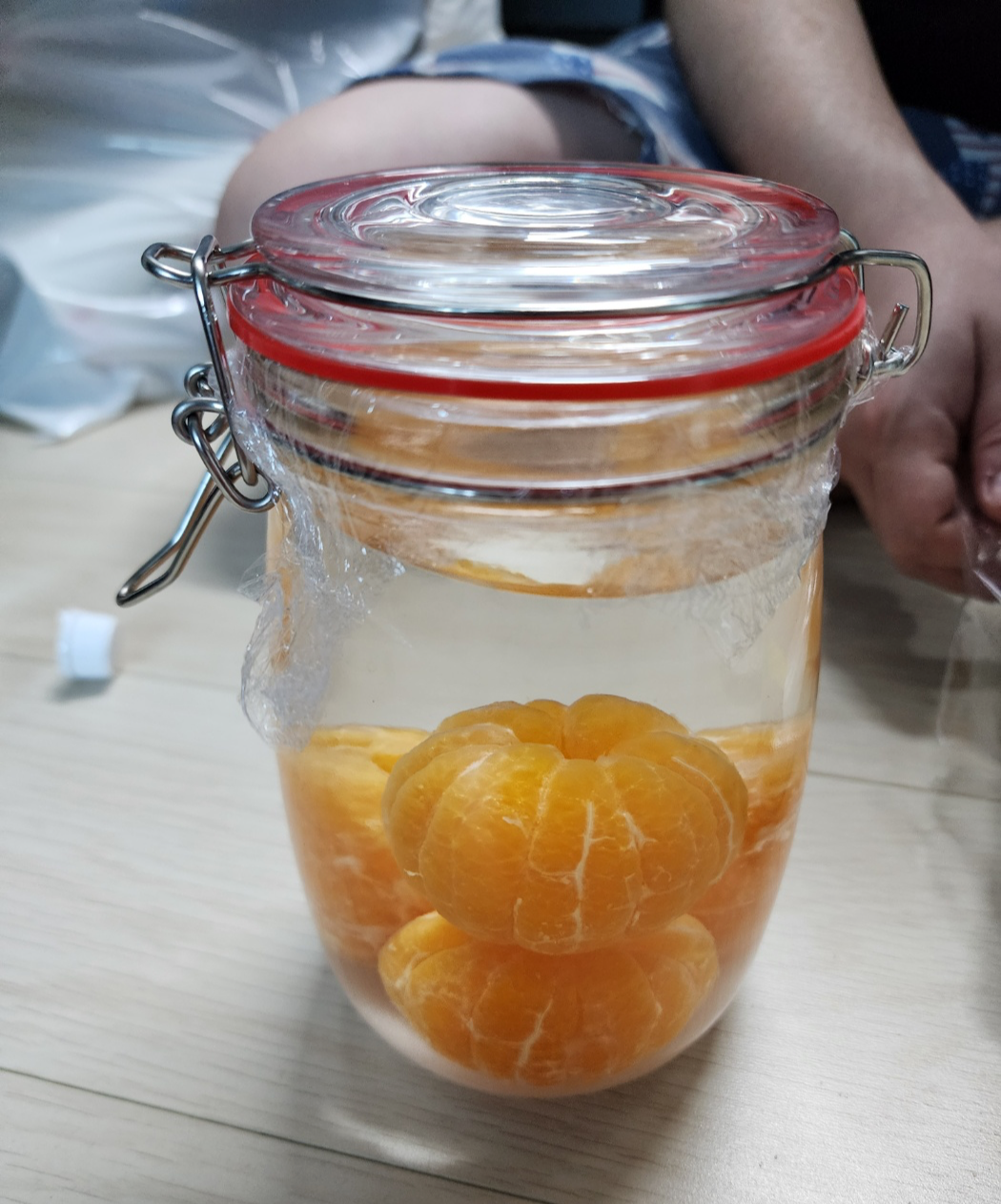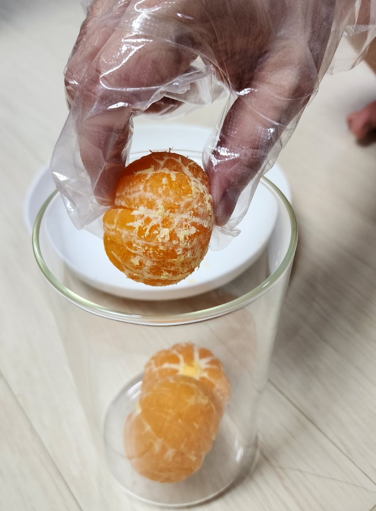 이제 열탕처리한 용기에 귤을 넣어줍니다.