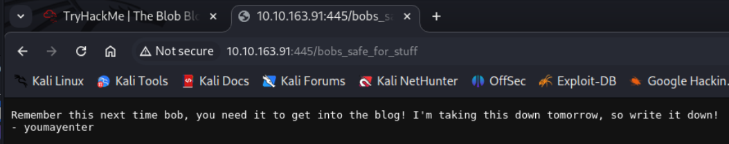 해당 문자열을 [target IP]:445/bobs_safe_for_stuff 로 browser 검색함