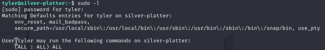 이제는 tyler의 sudo 권한을 확인해봅시다.