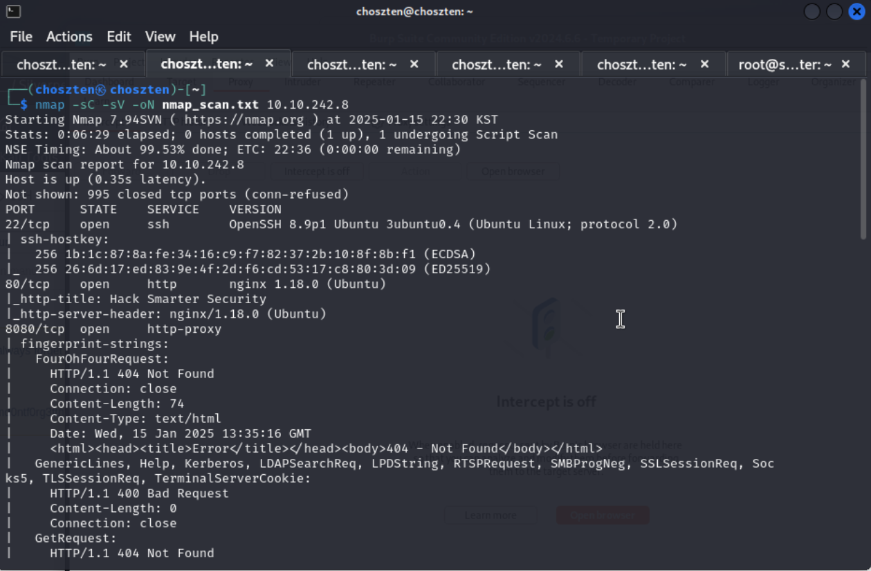 여기서 중요하게 봐야 할 부분은 타겟 IP에는 22번 포트에 SSH가 열려 있고 80번과 8080포트가 열려있다는 사실을 확인할 수 있습니다.