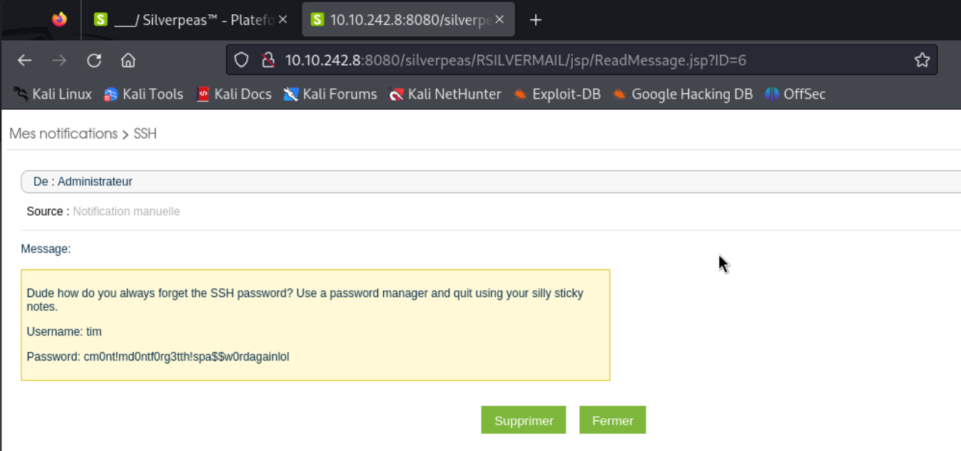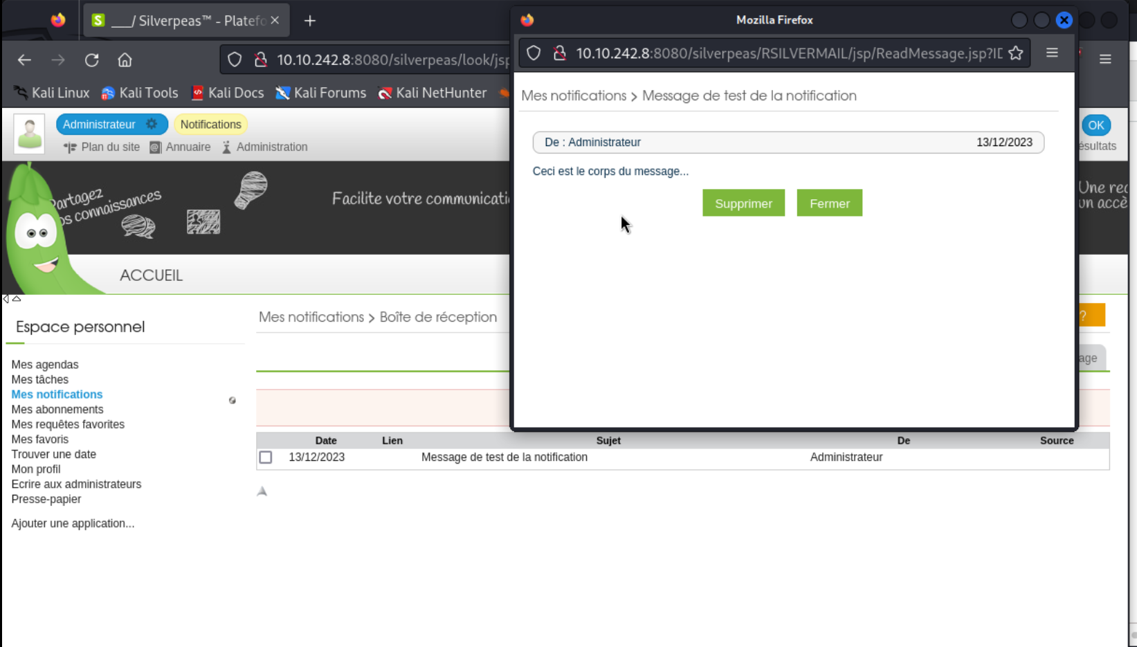 뭔가 찾았습니다. http://10.10.242.8:8080/silverpeas/RSILVERMAIL/jsp/ReadMessage.jsp?ID=2 이런 url인데 CVE에서 찾은 근거를 기반으로 ID parameter를 조작하여 순회해서 다양한 메시지를 찾아봅시다.