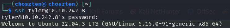 우리는 DB의 비밀번호와 인간의 심리를 이용해서 tyler의 SSH 계정에 접속해봅시다.