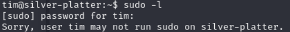 성공했습니다. 이제 tim의 권한을 파악해봅시다. sudo -l 을이용해 해당 사용자가 sudo 명령어를 통해 실행할 수 있는 작업 범위와 제한 사항을 확인해봅시다.