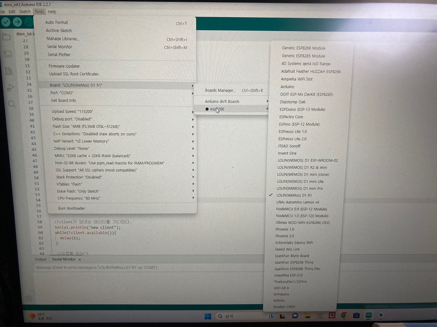 1. 보드 이름 ( esp8266 -> LOLIN(WeMos)D1 R1)